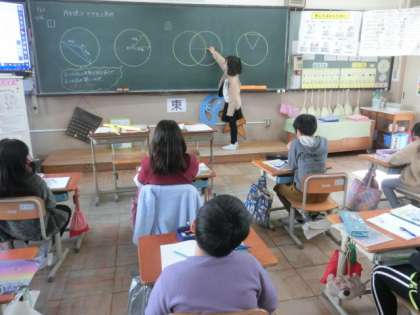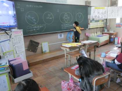 円を使ってできる三角形をみんなで考えました。円の中にできる三角形は,どんな三角形なのか,わけも言いました。中心,円の回り(円周),半径という言葉を使って答えられるようになってきました。
