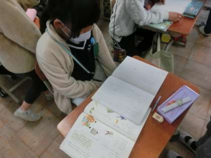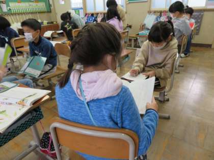 身の回りで見つけた,冬を感じたものについて,文や詩を書いたり,俳句や短歌にしたりして表しました。書いたものは,友達に読んでもらったり,読んで聞いてもらったりして交流しました。今日は寒いので,雪が降りそうです。