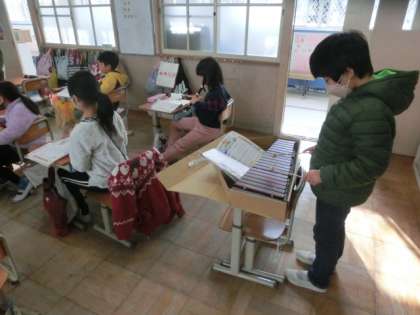 パフでは木琴や鉄琴を使ってリコーダーと合奏をしています。まずは木琴と鉄琴のパートを歌えるようになり,鍵盤を見てたたけるように練習しています。少しずつですがきれいな鍵盤の音が聞こえるようになってきました。リコーダーのパートはリズムが1番と2番で少し違うので細かいところにも気を付けて吹いています。