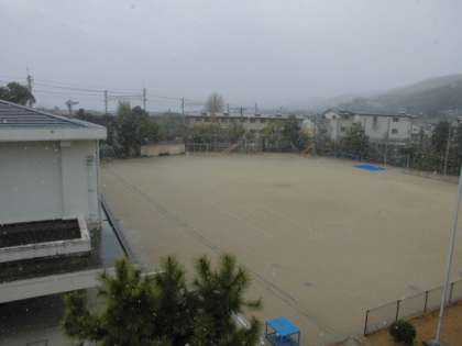 体育館の屋根にも山の木々もうっすらと雪が積もっていました。