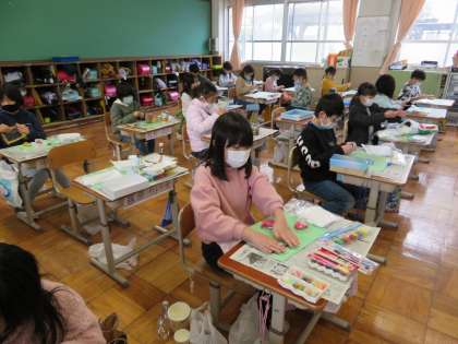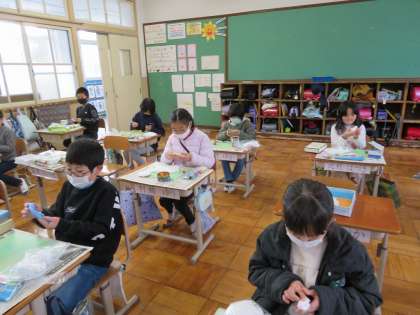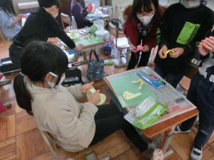 紙粘土で空き容器を小物入れに変身させました。用意した容器を切ったり組み合わせたり貼り付けたりして,自分の考えている小物入れの形を作りました。その上から色を付けた紙粘土を貼り付けていきました。さあ,どんな小物入れになるのか楽しみです。
