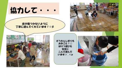 机を運ぶとき,バケツを運ぶときなど必ず二人組になって安全第一で掃除に取り組んでいます。