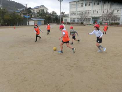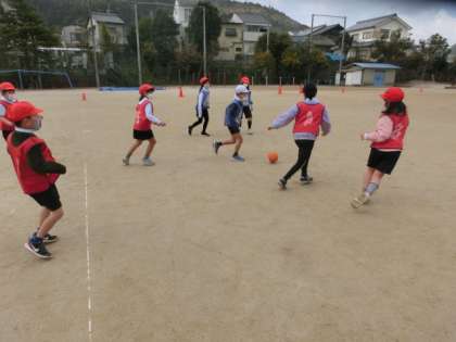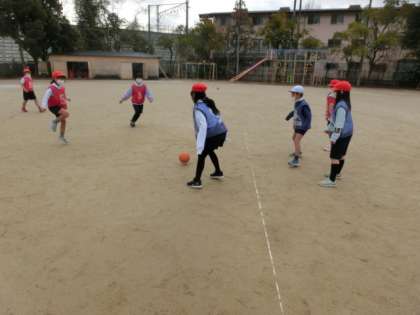 ルールを確かめて3対3で試合を始めました。空気を抜いたボールで行っているので,きつく蹴っても遠くまで飛びません。当たってもいたくありません。みんなで思いっきり楽しんでほしいです。