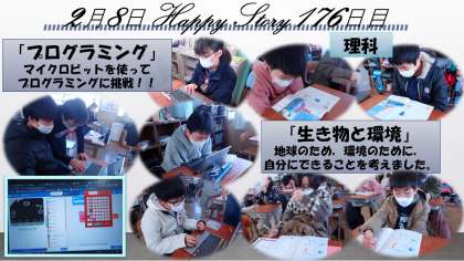 3,4時間目は理科でした。マイクロビットを使って,プログラミングに挑戦しました。音楽を作ったり,画面の中のキャラクターを躍らせたり,それぞれ楽しみながら工夫して学習を進めていました。