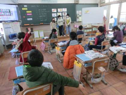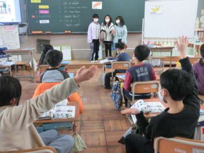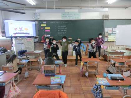Unit 8 「What’s this?」をしています。今日は,「Let’s Chant」に合わせて,身振り手振りを入れて行いました。「monkey」など,とても上手に行うことが出来ました。次は,3ヒントゲームです。3人が前に出てみんなにヒントを出します。とても楽しく行うことが出来ました。