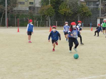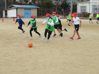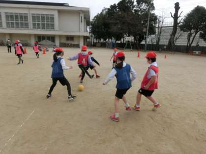 今日初めて1組2組合同でサッカーをしました。ルールの確認をして試合を始めました。サッカーの上手な子が一人で行うのではなく,苦手な子にシュートをさせてあげようと何度もパスを出してくれている姿が見られました。チーム全員がシュートを決めたグループも出てきました。みんな楽しく行うことが出来ました。