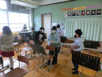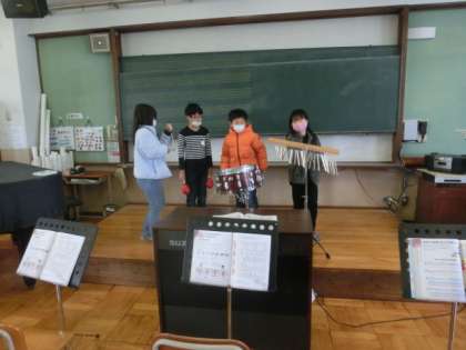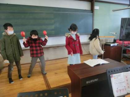 グループごとに分かれて,使いたい楽器を用意して「魔法の呪文」を演奏しました。音楽を流していると楽しくなってきて体をゆすったり弾んだりしながら楽しく取り組みました。