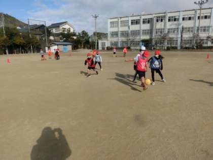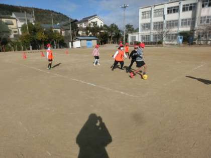 とっても寒かったけれど,たくさん動いてボールを追いかけたり蹴ったりしたので体が温まったようです。女の子も男の子も一緒に楽しく行っていました。ゴールもたくさん決まりました。