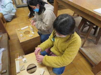 初めはみんな慣れない金づちの扱いで恐る恐るやっていましたが,慣れてくると怪我に気を付けながら楽しく取り組む姿が見られました。キットに入っている木を組み合わせて車のような形にしたり,生き物を作ったりおもしろい作品ができています。