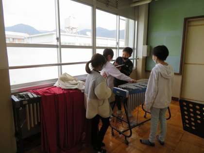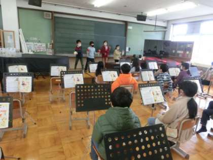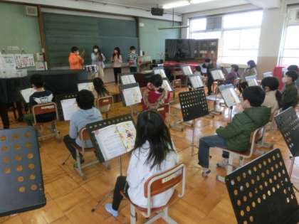 「おかしのすきなまほうつかい」の曲の途中に出てくるまほうをかけた時の音楽をグループごとに考えています。音楽室にはたくさんの楽器があり,みんなとてもわくわくしていました。1組は今日はどの楽器を使うかを考えました。トライアングル,ウインドチャイム,すずなど「どんな楽器がいいかな?」と楽しそうな様子でした。2組はグループごとに発表会をしました。それぞれのグループの音楽を聴いて自分たちとの違いやおもしろさを感じたようです。