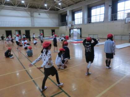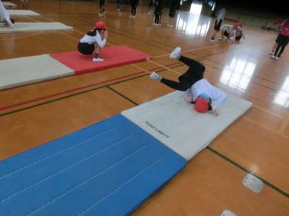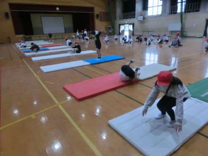 今日はマット運動をしました。体をほぐしたら,前転,後転,開脚前転,開脚後転,伸膝後転と自分の挑戦したい技に取り組みました。苦手な子は,傾斜を付けたマットの所に行って練習してできるようになりました。また,上手な子に手本を見せてもらいました。みんなで頑張って取り組みました。