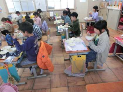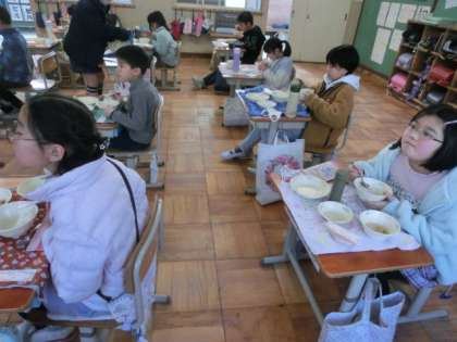 今日の給食は,「ひなまつり献立」でした。さばそぼろを入れた「ちらしずし」と「菜の花のすまし汁」でした。とってもおいしくて残さず食べました。さらに,今日はみんなが楽しみにしていた三食ゼリーがデザートにつきました。いつも給食がおいしくて,みんな給食時間を楽しみにしています。