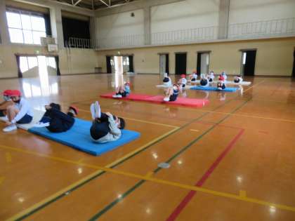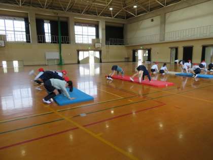 これまでにやった前転,後転,開脚前転,開脚後転などをやりました。後転はやはり難しいと思う子も多く,足が上がりきらず回らなかったり足が曲がっていてマットから落ちてしまったりとうまくいくように何度もチャレンジしていました。できるようになった子は頑張っている子にアドバイスをしたり,コツを教えたりとお互いにかかわりあっている姿が見られとても素敵でした。