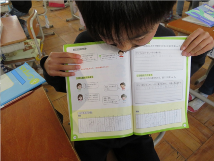 自分の生活の計画を立てています。「朝は何時に起きようか。」,「勉強はいつするか?」など春休みの自分の規則正しい1日の生活計画として考えました。子どもたちは友だちの計画を見ながら楽しそうに取り組んでいました。