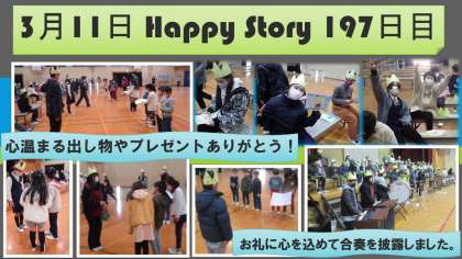 3.11と聞くと,まだ記憶に新しい東日本大震災のことを思い出します。この日は,いつあのような大地震が起こるかわからない,地震大国日本で暮らしていることを改めて実感する日ですね。今,何事もなく子どもたちと楽しく過ごしていることが奇跡。本当にありがたいことだと感じました。後7日,204日間無事に走り切れることを祈ります。