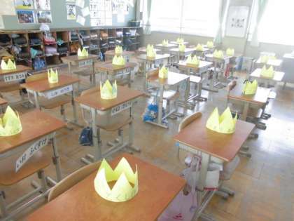 先週の金曜日,教室に入ると4年生が卒業のお祝いに作ってくれた王冠が一人一人の机に置いてありました。