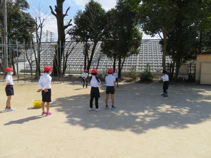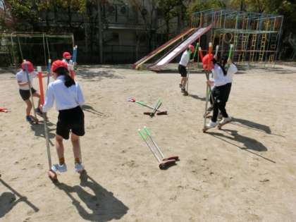 一輪車,フラフープ,大縄跳び,竹馬,フリスビーをグループごとに行いました。フラフープや大縄はやってことがありますが,一輪車や竹馬はやったことがない子が多く,「難しい!」,「できないよ…!」と言いながら頑張って取り組んでいました。