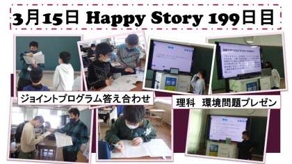 3月15日 happy Storyは長かった100日台が終わろうとしています。AIさんの「Story」にもあるように「限られたとき」の中で毎日を精一杯Happyに過ごしてきた6年生の集大成である「今」。199日目はどんな1日だったのでしょうか?