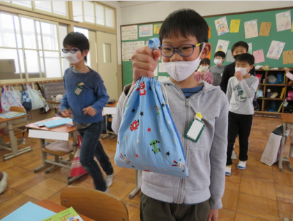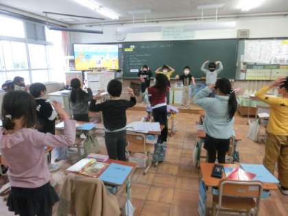 外国語では歌に合わせて体を動かしました。曲は“Head,Shoulders,Knees and Toes"に合わせて体の部分をおさえました。曲のテンポがだんだん速くなるので「ああ!ついていけない…。」と言いながらみんな楽しんでいました!