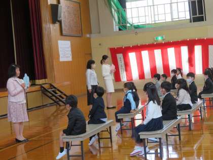 入学式では,校長先生の『いのちを大切にすること・自分から学習すること・大きな声であいさつをすること』というお話をしっかりと聞くことができました。教室では,自分のいすに座ったり,教科書を見たりしました。