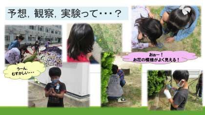 動くものを見るときは見るものを動かす,動かないものを見るときは虫めがねを動かす・・・と説明して十分に理解をしていました。ですが,実際に虫めがねを使っている様子を見ると,ついつい頭が動いてしまう子がいたり,ダンゴムシ!動かないでーと言っている子がいたり,はじめての虫めがねに対する反応がとても可愛らしく思いました。