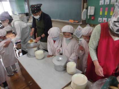 みんな一生懸命エプロンを着て,重たい食缶を運んで,