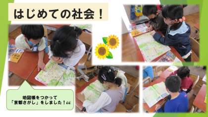 盛りだくさんの一日。まずは,はじめての社会がはじまりました。6年生まで大切に使う地図帳を用いて,子どもたちと一緒に地図帳から京都さがしをしたり,クイズをしたりして大盛り上がりでした。そのあと,「わたしのまち みんなのまち」の学習を行いました。