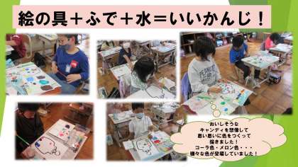 そして,図画工作では絵の具を楽しく使いました。キャンディ瓶の中に,いろいろな味の飴をつくってみましょう!と声をかけると,水を上手に混ぜたり,色を混ぜ合わせたりして,楽しんで活動することができました。