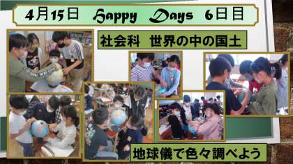 社会科では,地球儀の学習をしました。地図帳と地球儀の違いを知った後,グループごとに地球儀を使って色々な国や距離を調べました。これからの学習でも地図帳や地球儀を使って世界の中にある日本について詳しく学習していきます。
