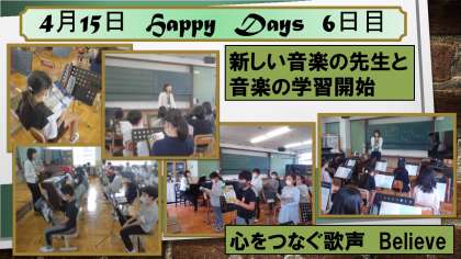 音楽科の学習では,新しい音楽の先生との初めての学習でした。自己紹介をしていただいた後,「Believe」を歌いました。子どもたちの美しい歌声に惚れ惚れした担任たちでした。これからの学習でさらに歌声を磨いていってほしいですね。すごく楽しみです。