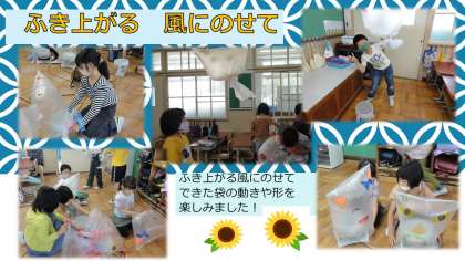 ずっと宙に舞っている袋があったり,すーっと教室の天井に届く袋があったりと,子どもたちは袋の動きや形に興味をもちながら活動することができました。