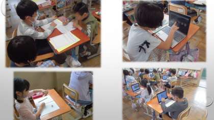 体育でリレーあそびをしています。今日はバトンパスの練習をしたり,おきかえリレーをしたりしました。バトンをわたすとき,指をそろえると渡しやすい,よく見て渡すといいなど,気づきながら練習をすることができました。