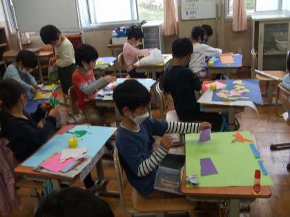 先週の図工の時間では,おうちから持ってきたいろんな紙をやぶったり,画用紙に張り付けたりする活動を行いました。