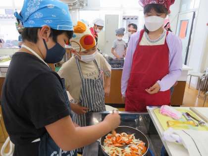 使うものを洗い,野菜を切ったり,いためたり,グループで協力して取り組んでいました。包丁を使う時には,指を切らないように気を付けました!