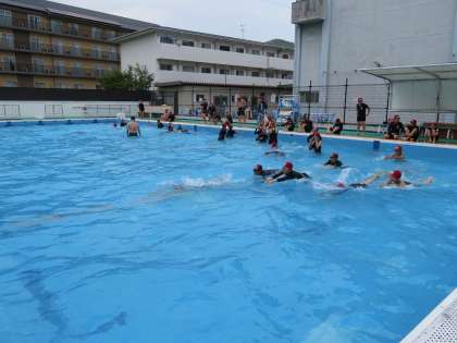 今日は1回目だったので水慣れを中心に行いました。けのび,バタ足をして楽しく活動しました。
