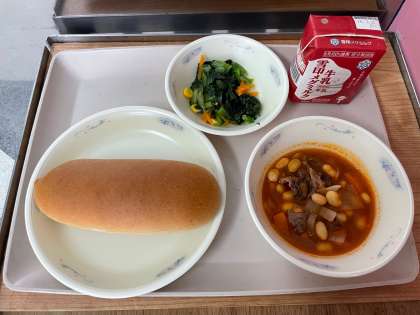 「大豆と牛肉のトマトにをにおいをかぐととてもいいにおいで,はやくたべたいなー!などといい気持ちになりました。これからもおいしい給食お願いします!いつもありがとうございます!」(5年児童)