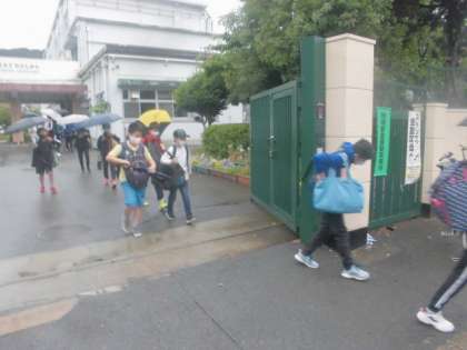 待ちに待った修学旅行です。少し天気は雨ですが,6年生51名全員元気に揃って出発式を行いました。