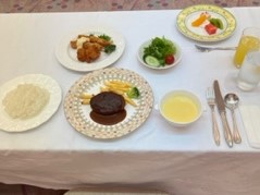 夕食は1階のホールでいただいています。メニューは子ども達の大好きなハンバーグです。ナイフとフォークに苦労しながらももりもり食べています。食べ終わったら、部屋へ戻ってお風呂の準備です。