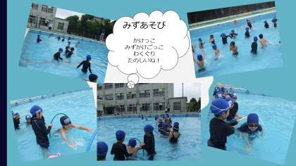 水慣れと違い,水深が70〜75cmくらいあり,子どもたちの胸あたりまで水がありました。その中で,いつものように歩いたり走ったり水かけごっこなどをしたりしました。最後に友だちが持ってくれている輪を通っていく輪くぐりをしました。