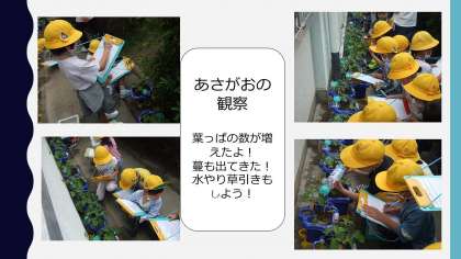 生活科の時間には,あさがおの観察をしました。毎日水やりをしていますが,改めてじっくり観察すると,葉の数が20以上あったり,蔓が子どもたちの口あたりまで伸びていたりと,随分大きく成長しているのがわかりました。