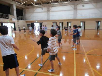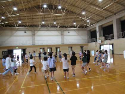 日程を確認した後,キャンプファイヤーで行うダンスの練習をしました。