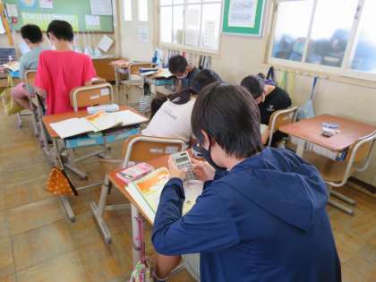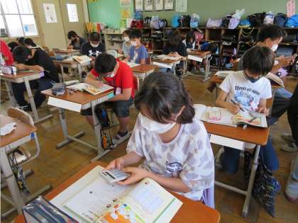 算数は資料の調べ方の学習に入りました。今日は平均値について学びました。電卓を使って資料の値の合計を出していましたが,「あれ…おかしい。」,「これは違う気がする。」と苦戦しながら取り組む姿が見られました。中には電卓を使わず,計算で頑張る児童もいました。