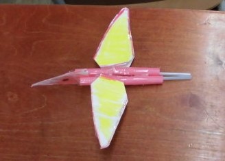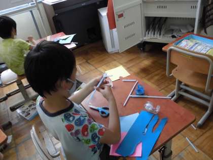 前回が動く仕組みを作り,作品のイメージ作りをしました。パタパタと動くには「どうしたらいいかな」「あ,こんな動きになった」「あ,それおもしろい」と様々につぶやきながら,作品を作り上げます。羽のようなもの,角のようなもの,葉っぱのようなものが陽気に動くものが沢山できました。