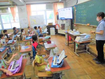2年生が歌うと教室中に元気な声が響きわたります。もっと素敵に歌うには友だちの声を聴き,リズムなどを合わせると音が一つになることに気がつきました。一人よりも二人,二人よりも多くで歌うと気分がよくなります。