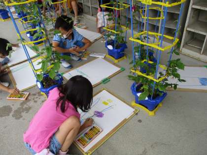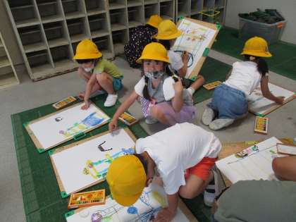 今日の図画工作の時間には、「あさがおといっしょに」ということで、あさがおと自分を描きました。