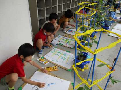 あさがおの花・つぼみ・蔓などの様子を観察していところをクレパスで表しました。花の描き方、それを見ている自分の描き方がそれぞれ違って、楽しい作品ができました。