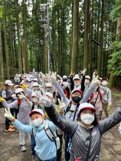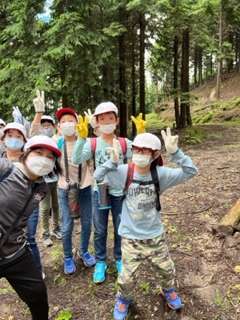 尾根道をずんずん進むと山の家へ向かう分かれ道にきました。みんなで一旦休憩です。下りは急でぬかるんでいるので気をつけております。転ばないようしっかり身体を支えてください??