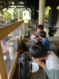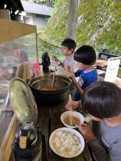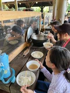 煙と豚汁の味噌の香りとみんなの笑顔。最高の昼ご飯です。