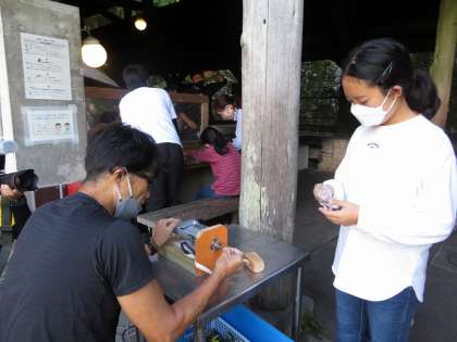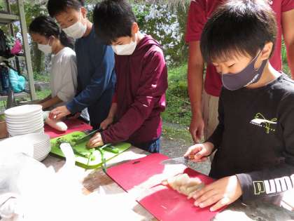 2日目は朝ごはんを食べて,ウッドキーホルダー作りをしました。山の家の思い出を絵に表していました。その後,野外炊事で豚汁を作りました。班で協力し,火起こしや野菜を切っていました。「自分の班は一番おいしい!」,「めっちゃうまい!」ととても喜んでいました。片づけも鍋のすすがつかないくらいとてもきれいに洗いました。みんなで協力する姿がとても素敵でした!