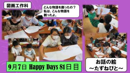 昼の学習は,5年生の大好きな学年学習です。今日は図画工作科の「お話の絵」の学習を学年でしました。今回は,国語科で学習した「たずねびと」を絵で表現します。